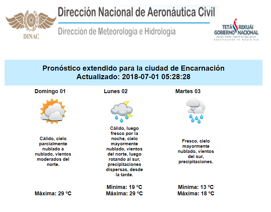El día de hoy, el cielo se presentaría con intervalos de sol y nubes, vientos moderados del sector norte y un ambiente que iría de cálido a caluroso inclusive en el Chaco, norte y algunas localidades del centro de la Región Oriental. Mañana lunes, ya habría un aumento de nubosidad a nivel país, y podrían presentarse algunas lluvias en el sur de nuestro territorio a partir de la tarde y en el centro hacia la noche. Con el ingreso de un frente frío, hacia el final de la jornada, en éstas regiones ya girarían los vientos al sur, produciéndose un leve descenso de las temperaturas.