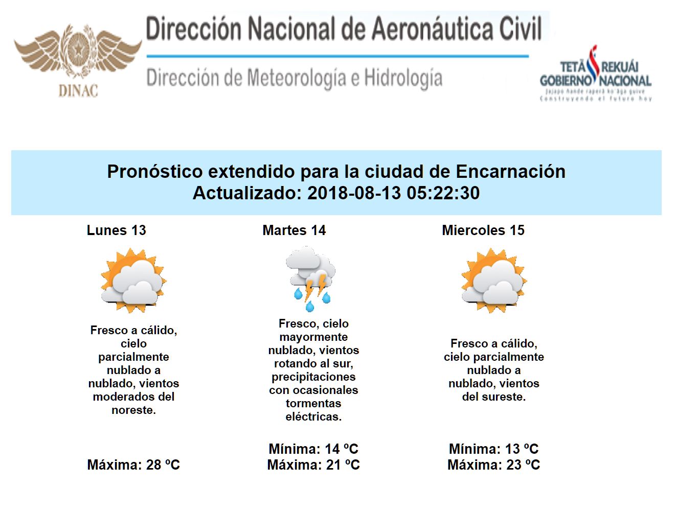 Para la jornada de hoy lunes, se prevé una ambiente fresco en las primeras horas, que rápidamente con la salida del sol, se iría tornado cálido e incluso caluroso en algunos puntos, como en centro y norte de la región Oriental y en el Chaco, acompañando por vientos moderados del sector noreste y con baja probabilidad de lluvias. Sin embargo, a partir de mañana martes, con la incursión de un débil frente frío, el ambiente se tornaría inestable, generando condiciones favorables para precipitaciones acompañadas de ocasionales tormentas eléctricas en todo el país. Inicialmente en el Chaco y al sur de la región Oriental, para luego ir afectando al resto de la región Oriental.