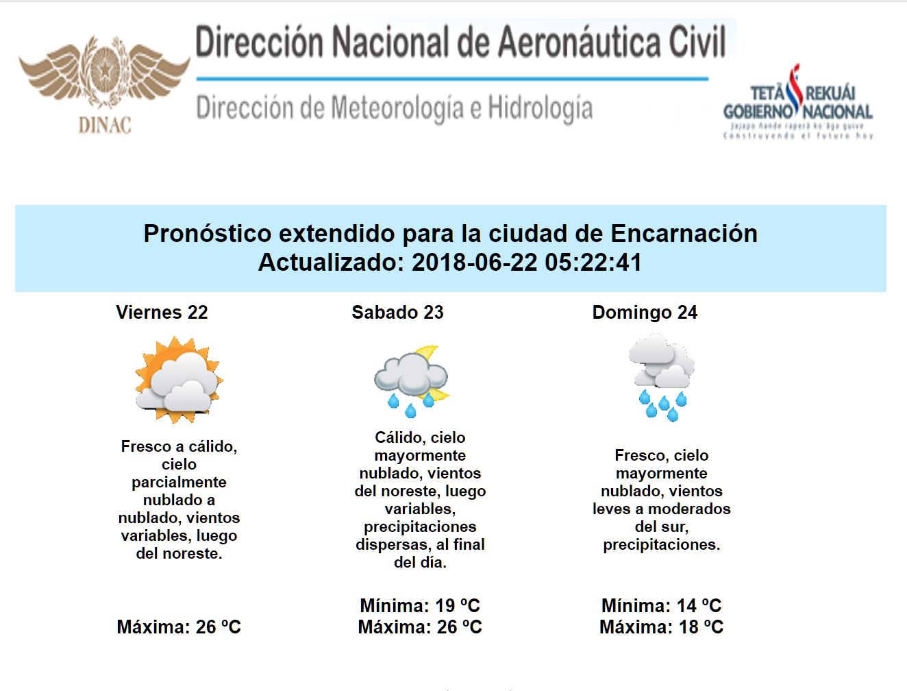 Las condiciones de buen tiempo, con ambiente predominantemente cálido y vientos del noreste, prevalecerán el día de hoy, como así también también mañana. El cielo se presentaría con intervalos de sol y nubes. Mañana se acelerarían los vientos del sector noreste y serían moderados; y hacia el final de éste día podrían comenzar algunas lluvias dispersas en ciertas localidades del centro y sur del país. El día domingo, con el ingreso de un débil frente frío, las lluvias podrían ya abarcar gran parte del país, pero vale decir que no serían acumulados importantes de agua lo esperado, salvo localidades del extremo sur del país, pero en forma muy puntual. Los vientos ya irían rotando al sector sur, con intensidad leve a moderada, quedando un ambiente predominantemente fresco.