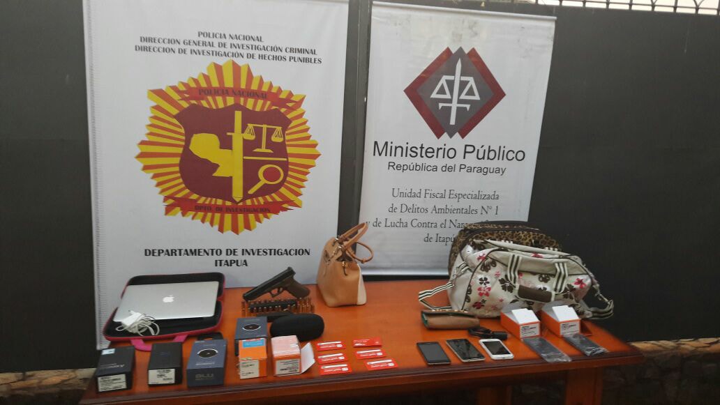 El procedimiento se realizó en una vivienda ubicada sobre la avenida Japón entre Capellán Molas y General Gamarra de esta ciudad. Allí se pudo incautar una pistola marca Glook, metal polímero con dos cargadores y 36 cartuchos cal. 40mm sin percutir, cinco teléfonos celulares de distintas marcas, varias cajas de celulares vacíos, una notebook marca Iphone color plata, tres bolsos de mano (femenino) conteniendo documentos varios y varias pastillas de color celeste y morado.