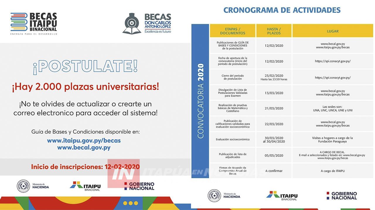 En la fecha, inician las postulaciones para jóvenes a las becas de itaipu, existen un total de 2.000 cupos que otorgan una beca completa para la carrera universitaria de los beneficiarios.