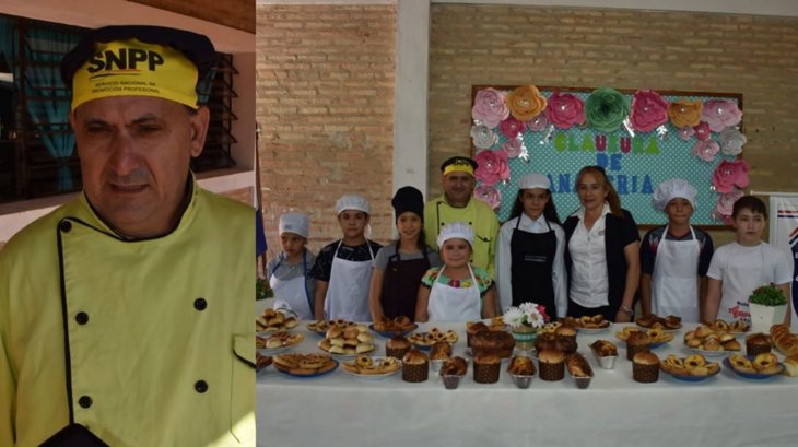 Don Luciano Ortiz es instructor del SNPP (Servicio Nacional de Promoción Profesional) en Misiones, pero en sus ratos libres enseña a los alumnos de la escuela Santo Ángel, de San Ignacio, a hacer todo tipo de panificados y dulces, de forma gratuita.