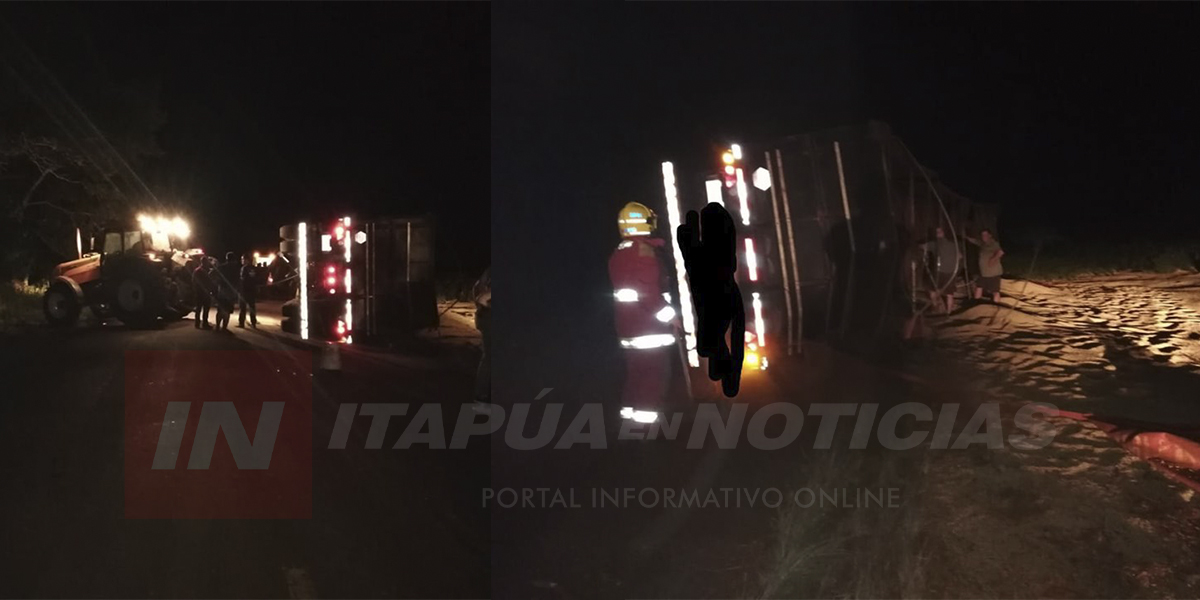 Por una hora y media integrantes de Cuerpo de Bomberos Voluntarios de Capitán Meza trabajaron durante la noche de este miércoles tras un accidente que se registró en el Km 12 de este distrito, donde la carreta llena de soja de un camión volcó luego de que el conductor realizara una maniobra para esquivar a una motocicleta que se le atravesó en una pronunciada curva del lugar, según detalla el reporte bomberil.