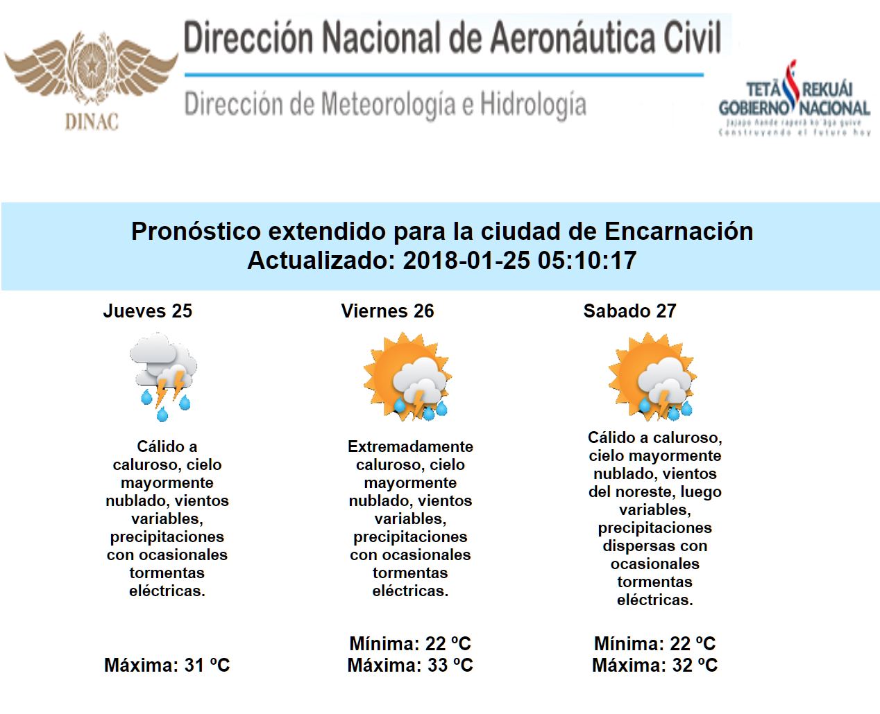 Hoy jueves amanecemos con lluvias puntualmente copiosas sobre distintos puntos del Chaco paraguayo y dicha condición se traslada tambien durante la mañana sobre la región Oriental, permaneciendo inestable, con precipitaciones y ocasionales tormentas eléctricas de manera intermite, no descartando que de forma puntual sigan generándose lluvias intensas acompañadas de tormentas fuertes en algunos sectores del territorio nacional. Mañana viernes persistiría la condición inestable sobre todo el país, observando una alta probabilidad de lluvias significativas de nuevo en ambas regiónes, mientras que para el sábado las lluvias serian de manera dispersa en gran parte del país, a excepción del extremo oeste de la región Occidental y el sur de la región Oriental, donde lluvias más importantes se registrarían durante ese día. Hoy el ambiente se tornara algo caluroso, aplacado por las lluvias en ciertos momentos, mientras que mañana y el fin de semana aguardamos que predomine un ambiente extremadamente caluroso en gran parte del territorio nacional.