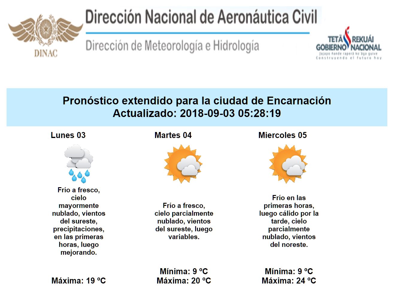 El análisis de los diferentes modelos indican que las precipitaciones en forma de lloviznas se registrarían hasta la mañana del día de hoy lunes, a partir de la tarde el mejoramiento seria total a nivel país. El ambiente se mantendrá frío durante las mañanas y las noches hasta el día miércoles, con las tardes cálidas. La tendencia es que hacia el día jueves las temperaturas vayan en aumento con un ambiente fresco la mayor parte del día y más cálido durante las tardes; inclusive caluroso en algunos puntos del territorio nacional.