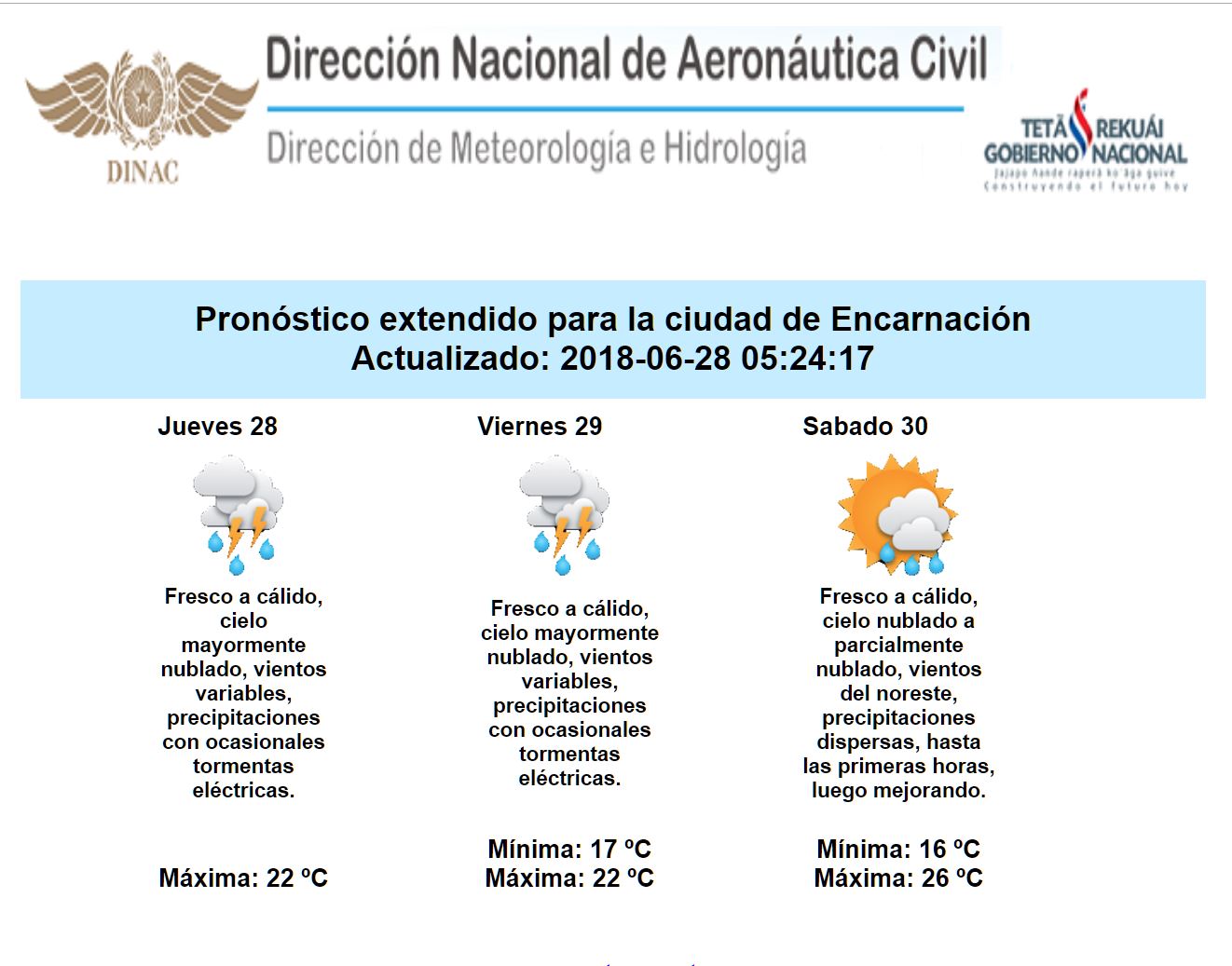 Precipitaciones con tormentas eléctricas comenzaron a desarrollarse sobre el Chaco paraguayo y el norte de la región Oriental durante la noche de ayer, extendiéndose luego sobre el centro y este de la región Oriental en el transcurso de la madrugada; núcleos de tormentas dispersos siguen afectando a varios puntos del país y según los últimos análisis se prevé que dicha condición de inestabilidad persista durante gran parte de la jornada de hoy, sobre todo en el centro y sur de la región Occidental y el centro, sur y este de la Oriental, no descartando que puntualmente sigan presentándose tormentas fuertes. Mañana viernes seguirían las lluvias, aunque de manera más dispersa sobre todo en el centro, sur y este de la región Oriental, mientras que para el fin de semana se observa muy baja probabilidad de lluvias.