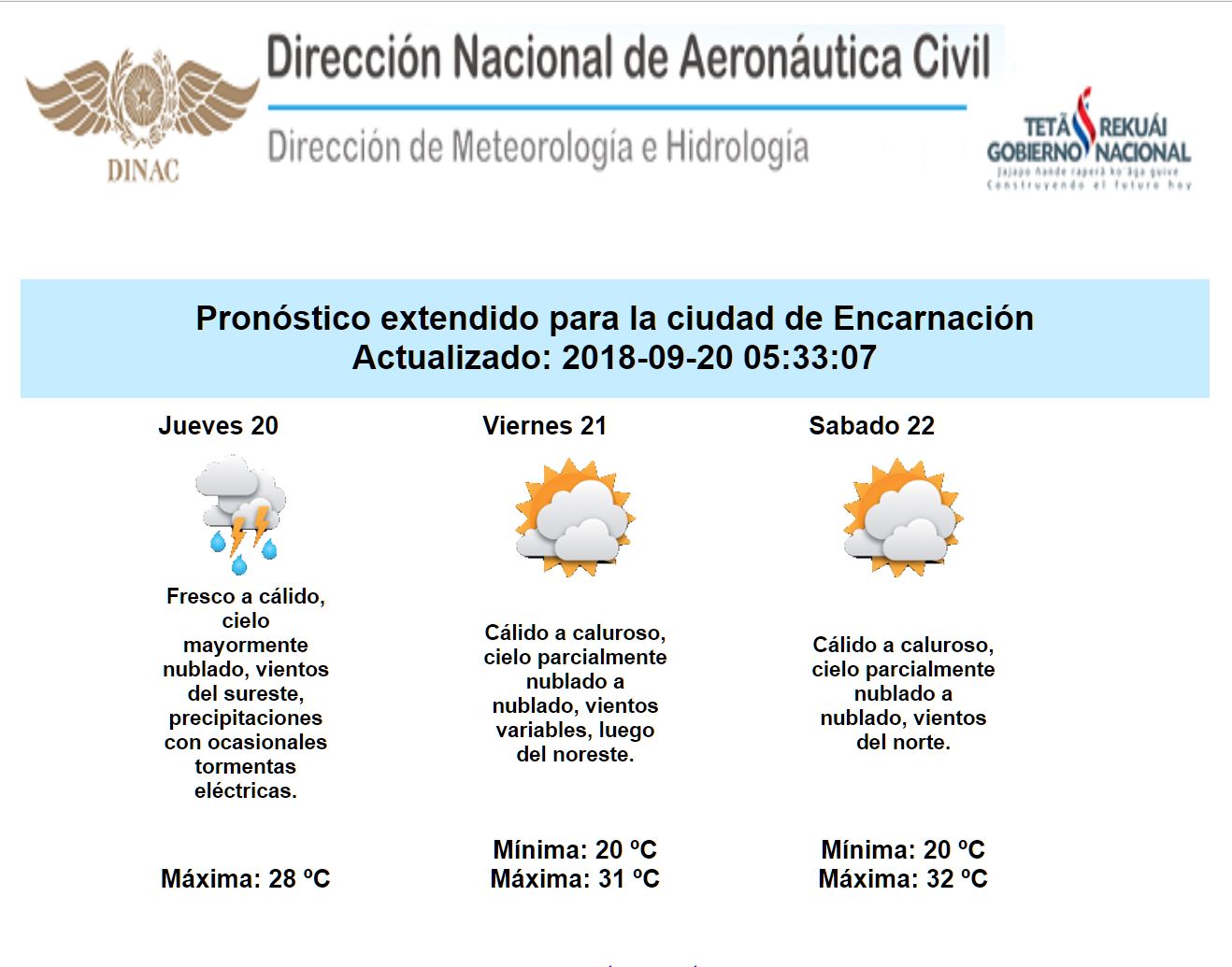 Un sistema de tormentas afecta el país desde la noche de ayer, se prevé que para la jornada de hoy jueves dicho sistema continúe sobre el territorio nacional generando precipitaciones y tormentas eléctricas de variada intensidad. Los acumulados parciales de precipitación registrados en las estacones automáticos fueron las siguientes: Aeropuerto internacional Guaraní 57mm, Villarica 53mm, Cnel. Oviedo 38mm, Aeropuerto Internacional Silvio Pettirossi 25mm, Aeropuerto Cap. Bernardino Caballero 23mm.