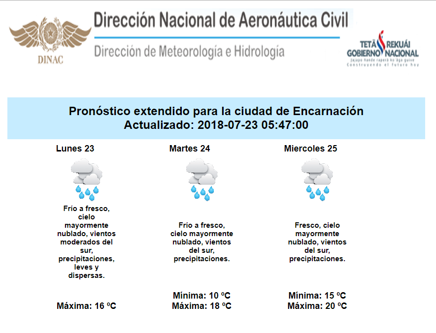 Hoy, en el inicio de una nueva semana, contaríamos con algunas lluvias en forma leve y dispersa principalmente sobre el centro, sur y este de la Región Oriental y el Oeste del Chaco durante la mañana . Condición similar se prevén para los días martes y miércoles.