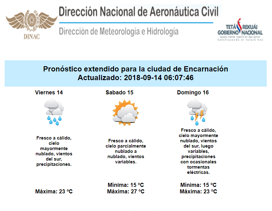 Durante la jornada de hoy viernes es aún elevada la probabilidad de precipitaciones en todo el territorio, en el norte del país se espera que estén acompañadas de tormentas eléctricas, mientras que en el resto, se espera lluvias débiles a moderadas. Para mañana sábado las lluvias y tormentas eléctricas se limitarían al norte del territorio.