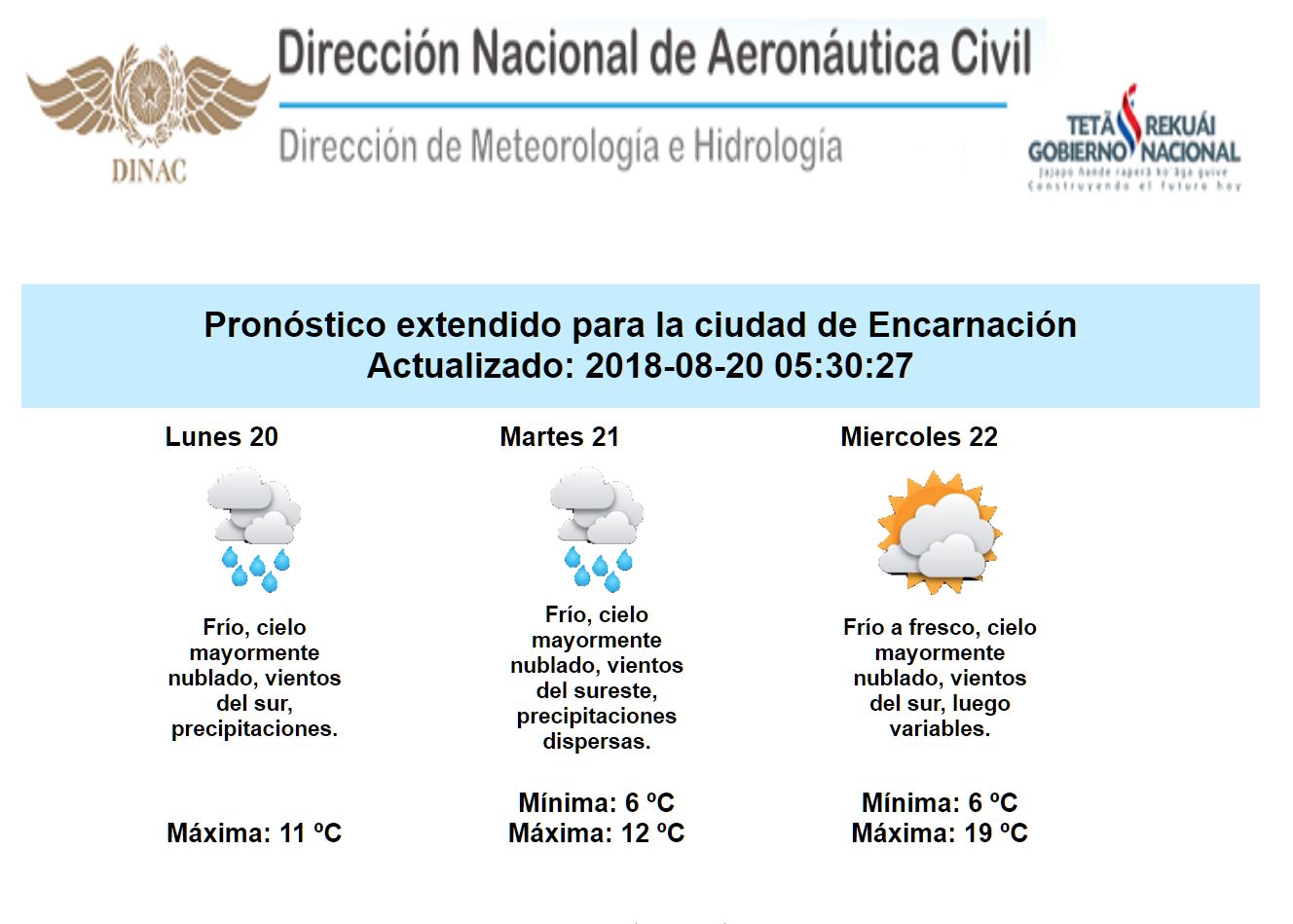 EL día de hoy lunes se presenta con temperaturas bajas y sensación térmica baja debido a la persistencia de los vientos moderados del sector sur, con probabilidades de lluvias intermitentes que continúan altas en todo el territorio nacional; al este y noreste de la región Oriental podrían ir acompañadas de ocasionales tormentas eléctricas. Mañana martes igualmente prevalece el ambiente inestable con probabilidades de lluvias principalmente en el centro y este del país. Con el paso del frente frío, las temperaturas fueron bajando, descenso que estaría predominando por lo menos hasta mediados de la semana, con amaneceres fríos y tardes frescas.