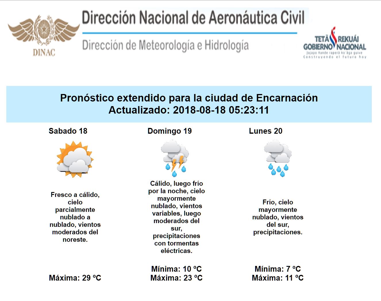 Los análisis continúan indicando alta probabilidad en la incursión de un frente frío sobre nuestro país durante el domingo, el mismo favorecería al desarrollo de tormentas en su zona pre-frontal, que afectarían inicialmente al sur de la región Oriental y el oeste del Chaco, para luego ir abarcando a otros departamentos del país durante el transcurso de dicha jornada. Además del marcado descenso de temperatura que generaría este sistema frontal, no se descarta otros fenómenos de tiempo significativo en forma puntual en algunos distritos del territorio nacional.