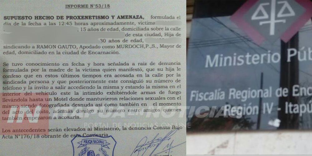 La madre denunció que su hija le confesó que el mencionado hombre la acosaba constantemente en la calle, posteriormente éste consiguió su número de teléfono y la invitó a encontrarse, la menor accedió y estando en el vehículo éste, siempre según la denuncia, la intimidó exhibiendo armas de fuego llevándola hasta un Motel donde mantuvo relaciones sexuales con el mismo, siendo fotografiada desnuda así como también en el momento del acto del sexual. Además, el hombre habría divulgado el número de la menor entre sus amigos que también empezaron a acosarla, detalla el parte policial.