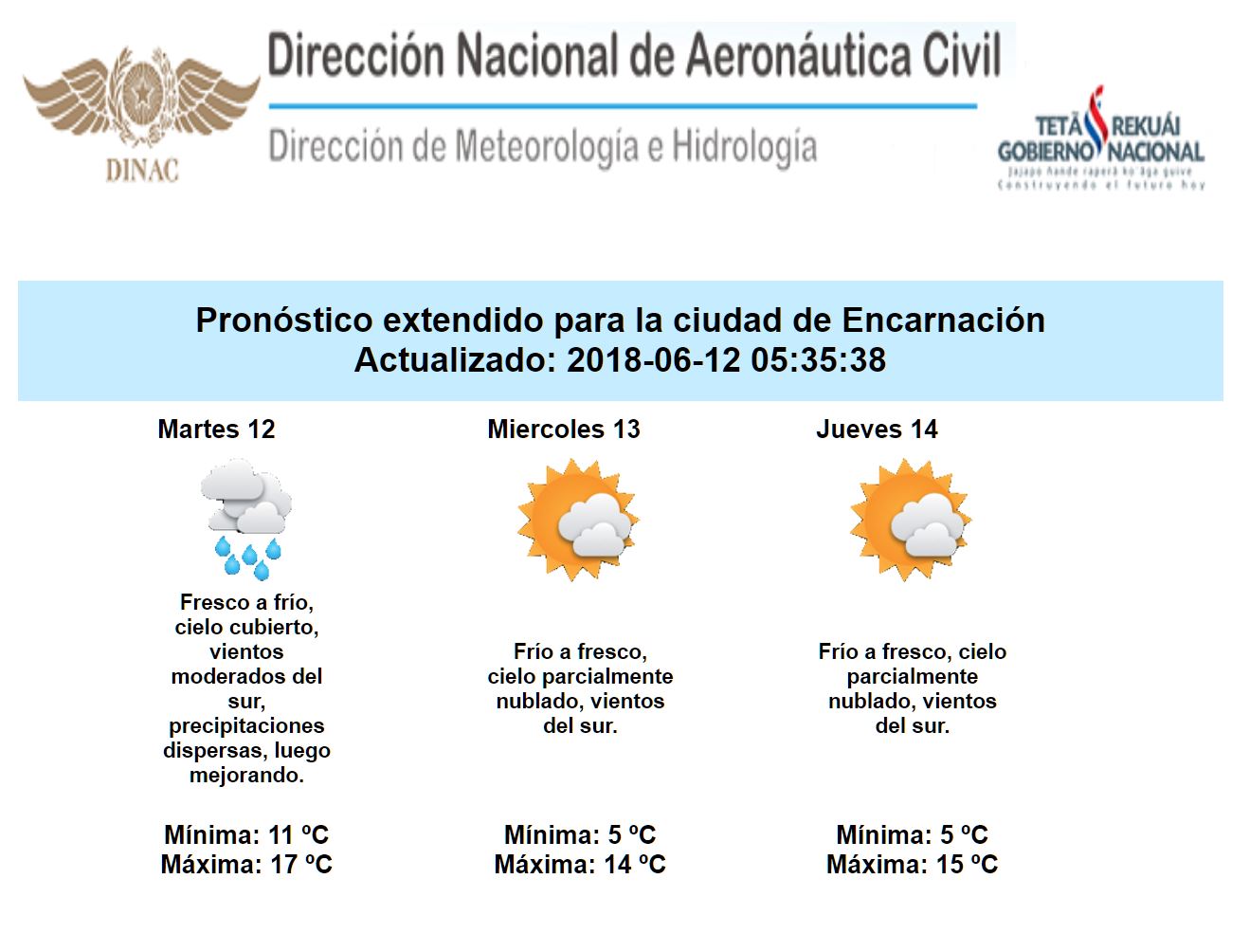 Los pronósticos indican que durante la jornada de hoy, la temperatura comenzaría a tener un marcado descenso, esto apoyado por los vientos moderados del sur, manteniendo un ambiente predominantemente fresco a frío sobre el país. Las lluvias más importantes se trasladarían al norte de ambas regiones, por lo que las condiciones de tiempo comenzarían a mejorar desde el sur y extendiéndose al resto del territorio nacional a excepción de algunas zonas del norte del Chaco. Con el paso de este sistema frontal se prevé una semana predominantemente fría a fresca, con mínimas que podrían estar por debajo de los 10 grados hasta el día domingo, principalmente en todo el bajo Chaco y la Región Oriental.