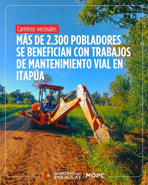 Más de 2.300 habitantes del departamento de Itapúa fueron beneficiados con trabajos de mantenimiento vial ejecutados por el Ministerio de Obras Públicas y Comunicaciones (MOPC), en el marco de intervenciones realizadas entre el 6 y el 9 de abril de 2026.