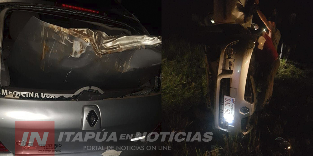 Un vehículo que se desplazaba sobre la ruta N° 1 con una pareja a bordo protagonizó un aparatoso vuelco en zona de Caraguatá, distrito de Carmen del Paraná límite con la comunidad de San Luis del Paraná de Encarnación.