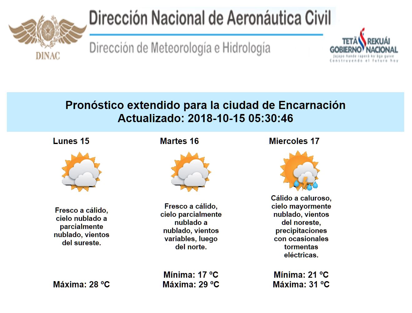 El pronóstico indica que algunas precipitaciones dispersas podrían registrase al este y noreste del país. Mañana martes nuevamente en dicha región existe la probabilidad de lluvias dispersas. A partir del miércoles la atmósfera se torna más inestable y la probabilidad de lluvias con tormentas eléctricas aumenta para la región Oriental.