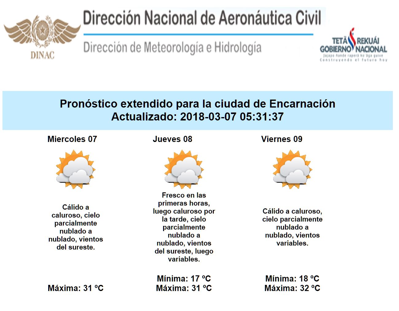 Los análisis indican que para la presente jornada las lluvias se limitarían al norte de ambas regiones, generándose en forma dispersa y acompañada de eventuales tormentas eléctricas; para el resto del país la probabilidad de lluvias se mantiene baja. Entre el jueves y viernes las lluvias se extenderían hasta el centro de la región Oriental presentándose en forma de chaparrones, mientras que sobre el Chaco, norte y noreste de la región Oriental serían en forma dispersa y con ocasionales tormentas eléctricas, siendo las más importantes las que se generen sobre la región Occidental. El ambiente se presentaría con noches y amaneceres agradables, en tanto que en horas de la tarde estaría de cálido a caluroso con alto contenido de humedad durante las próximas 48 a 72 hrs.
