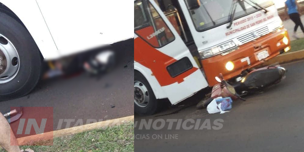 Un accidente de tránsito se acaba de registrar en un tramo de la Costanera República del Paraguay, donde un ómnibus de la Municipalidad de San Pedro del Paraná impactó contra un motociclista que terminó bajo la unidad de transporte. Ocurrió en cercanías del monumento ‘’Yo amo Encarnación’’