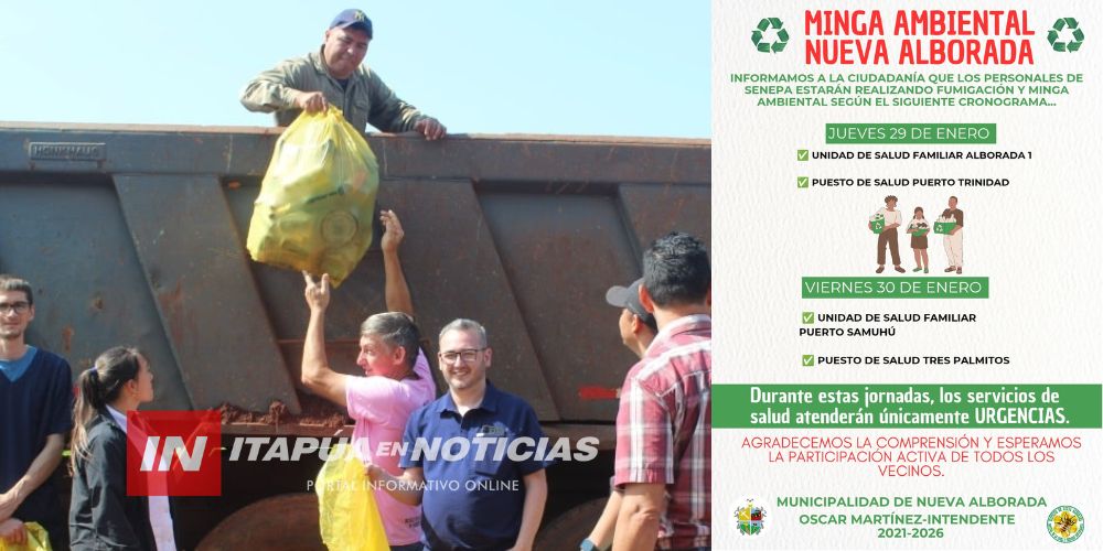 El cronograma de trabajo establecido es el siguiente: el jueves 29 de enero se intervendrán las zonas de Alborada Centro y Puerto Trinidad, mientras que el viernes 30 de enero se desarrollarán tareas en Puerto Samuhú y Tres Palmitos. Durante estos días, los centros de salud de las áreas intervenidas atenderán únicamente casos de urgencias.