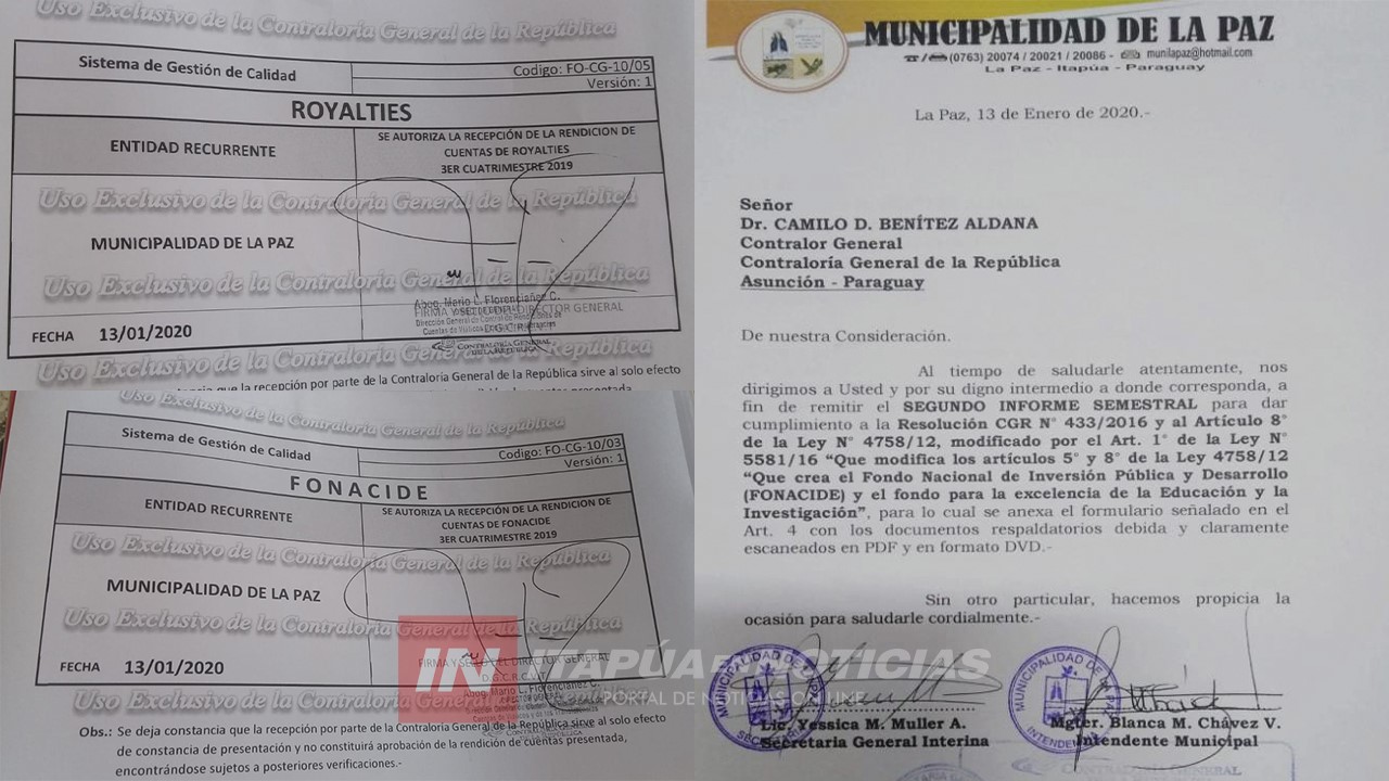 Gracias a la gestión de un excelente equipo de funcionarios de la Municipalidad de La Paz, la institución ha presentado en tiempo y forma las rendiciones correspondiente con relación al uso de recursos de FONACIDE, ROYALTIES, así lo resaltó la Intendente de La Paz Blanca Chavez.
