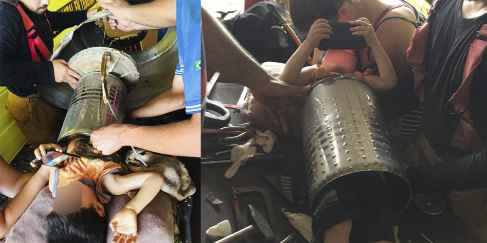 Los socorristas fueron llamados enseguida y una vez que llegaron al lugar, procedieron a cortar el artefacto, para liberar al pequeño, quien quedó atascada en la parte del tórax.