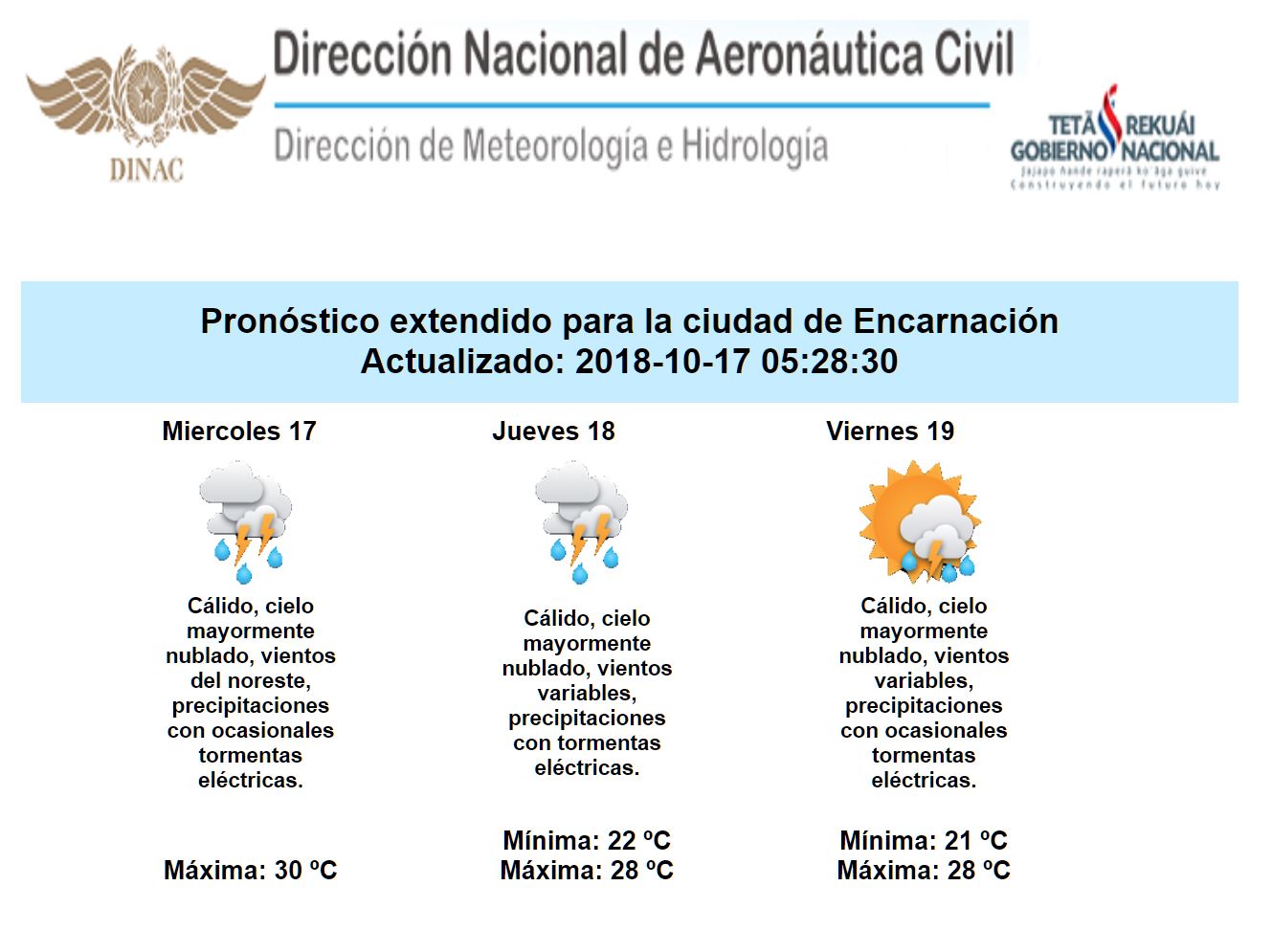 La mañana de hoy miércoles se presenta inestable con lluvias al norte del país, estas tormentas irían desarrollándose en el trascurso de esta mañana y continuando en la tarde para el resto de la región Oriental, existe alta probabilidad que dichas tormentas vengan acompañadas con fenómenos de tiempo severo, las cuales se detallan en el boletín adjunto.