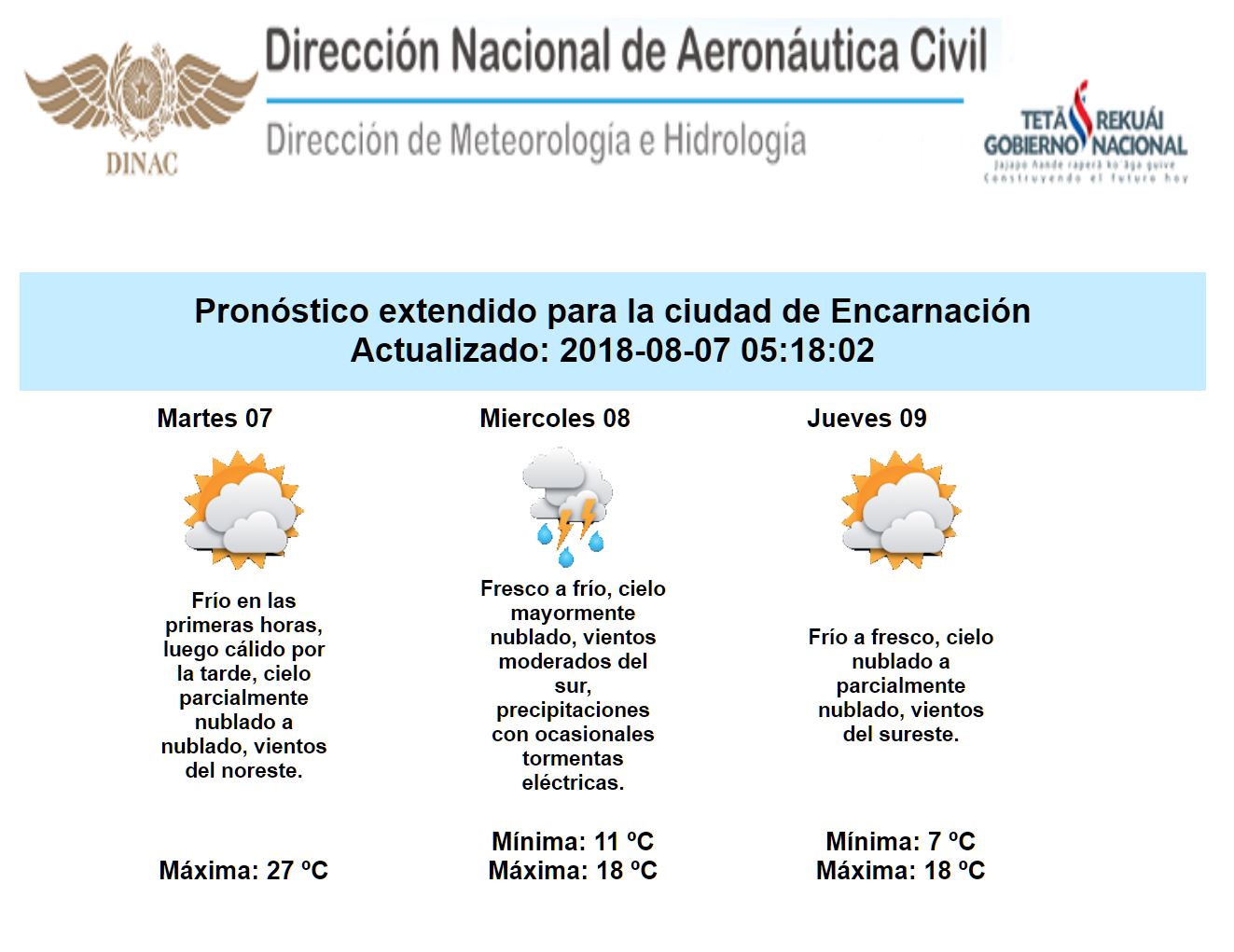 En lo que respecta a lluvias, la proximidad de un sistema frontal al sur de nuestro país, estaría favoreciendo a la ocurrencia de algunas precipitaciones hacia el final de la jornada de hoy martes, especialmente sobre el extremo sur de la región Oriental. Con la incursión de este frente frío sobre nuestro país durante la madrugada y transcurso de la mañana de este miércoles, se esperan lluvias y tormentas eléctricas sobre varios puntos del territorio nacional, incluso otras condiciones de tiempo significativo asociadas a estas tormentas, en especial sobre el centro, este, sureste y noreste de la región Oriental. A partir del jueves las precipitaciones se limitarían al extremo norte de ambas regiones durante las primeras horas, para luego ir mejorando; además el ambiente continuaría frío en las primeras horas, y de fresco a cálido en horas de la tarde.