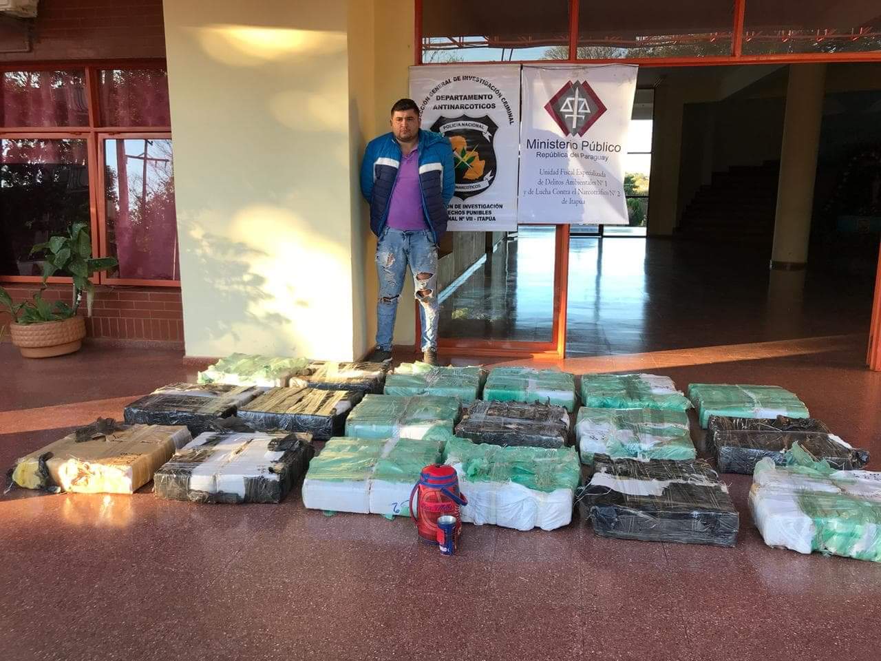 Tras el operativo de incautación de marihuana en el Barrio Arroyo Porá este domingo, la Fiscal de la Unidad Especializada contra el Narcotráfico N° 2 a cargo de Raquel Bordón decidió trasladar la droga a la sede de la Dirección Policial y tras el pesaje se confirmó que se incautó un total de 572 kilos de marihuana distribuida en 536 panes del interior del rodado guiado por Alexis Villalba Ferreira de 27 años, hijo del Concejal José Villalba (ANR), del distrito de Cambyretá residente en Campichuelo.