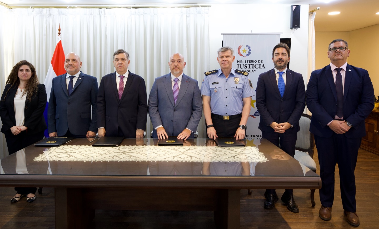 El reglamento fue suscrito por Rubén Maciel Guerreño, ministro sustituto del Ministerio de Justicia; Oscar Rafael Pereira, viceministro de Seguridad Interna del Ministerio del Interior; Carlos Benítez González, comandante de la Policía Nacional; y Marcos Alcaraz Recalde, representante de la Secretaría Nacional de Inteligencia. Acompañaron el acto Roberto Tartaglia, experto del programa EL PAcCTO 2.0 de la Unión Europea; Sergio Velilla, director de Asuntos Internacionales del Ministerio de Justicia; e Isaac Ferreira, viceministro secretario adjunto.