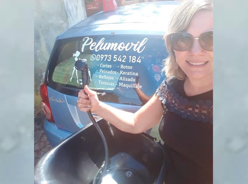 Con su “Pelumóvil», realiza servicios de cortes, bótox, peinados, keratina, reflejos, alisado, tinturas, y hasta maquillajes, según resalta el ploteado de su vehículo que muestra en las fotos que publicó en las redes.