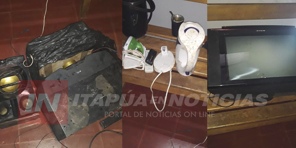 Todo ocurrió durante la siesta de este martes, resultaron aprehendidos David Talavera y Cristian Recalde Sosa ambos de 29 años, del poder de quienes se recuperaron un equipo de sonido de la Philips; un televisor de la marca Midas; un termo eléctrico y una plancha de la marca Brisa, todos denunciados como hurtados de la propiedad de Jorge Sanabria esa mañana.