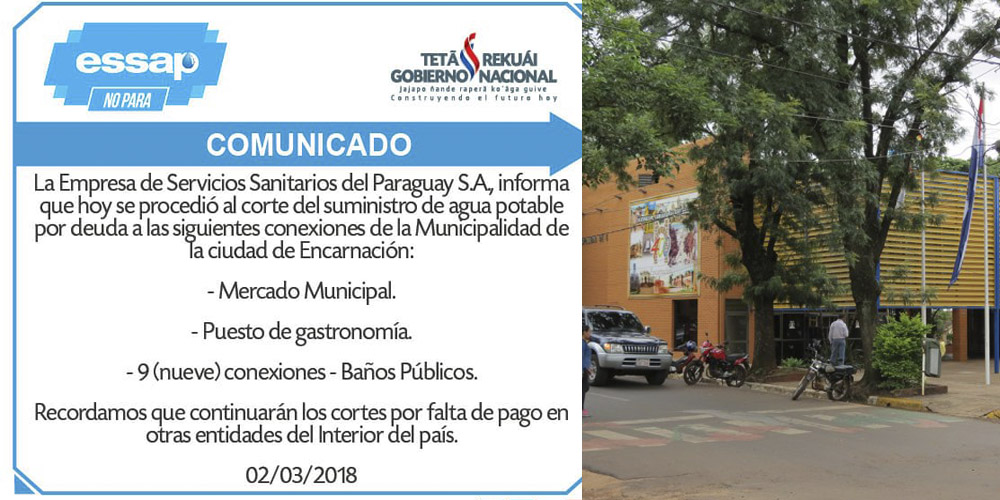 El Presidente de la Empresa de Servicios Sanitarios del Paraguay (ESSAP), Carlos Arce procedió a ordenar la realización de cortes en el suministro de agua potable para la Municipalidad de Encarnación por una millonaria deuda.