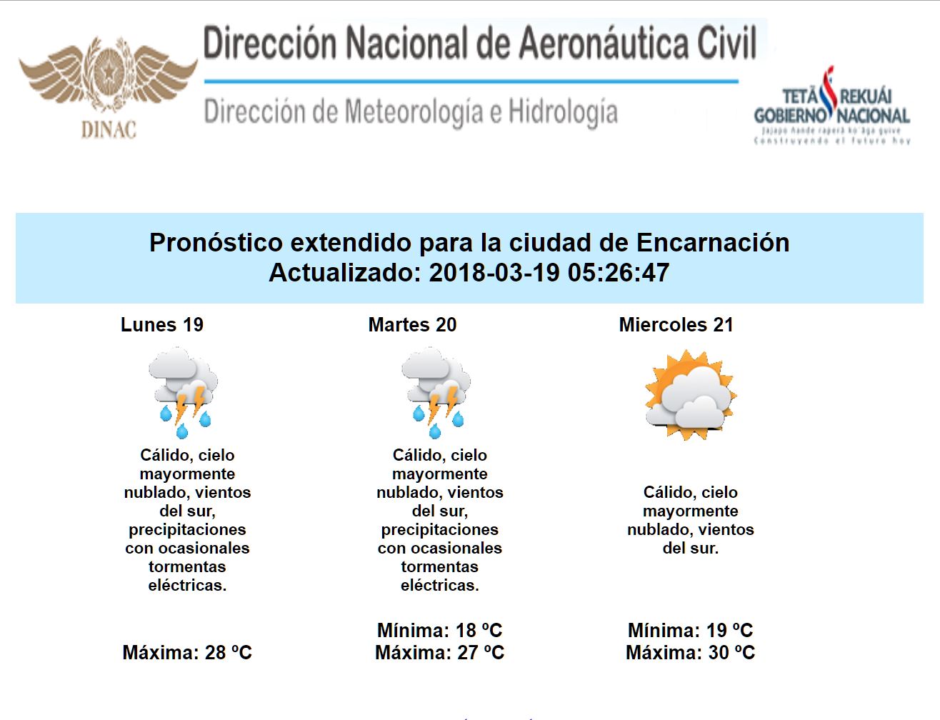 Para la jornada de hoy lunes se esperan precipitaciones y ocasionales tormentas eléctricas que afectarían a gran parte del país durante la mañana y la tarde del hoy. El día martes continuarían las lluvias con ocasionales tormentas eléctricas, en varios puntos del territorio nacional. Dicha condición se extendería hasta el día miércoles.