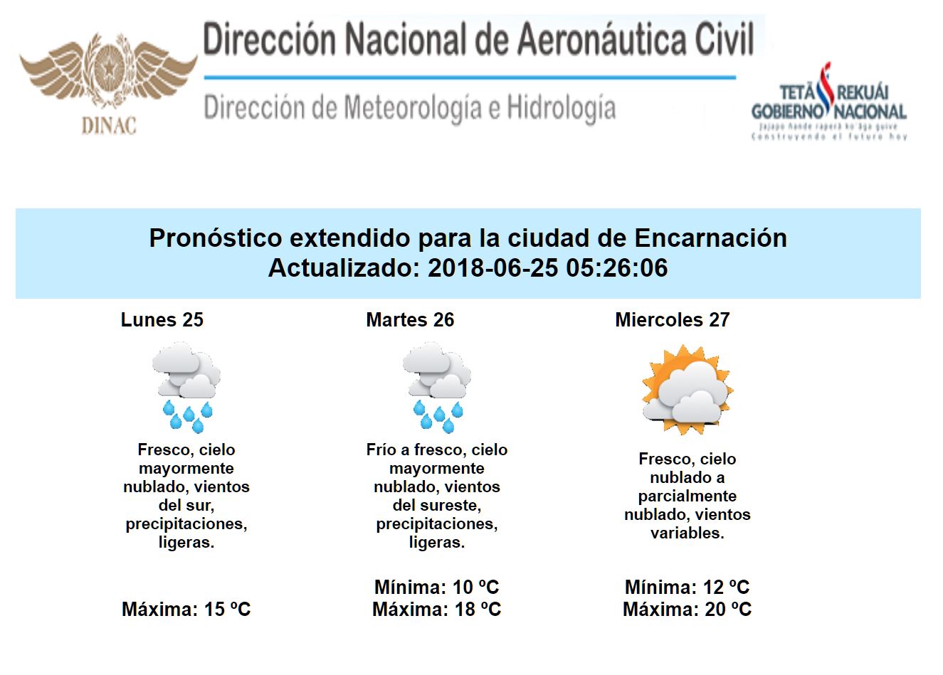 La jornada de hoy se presentaría fría en horas de la mañana en el sur del país, en el resto del país el ambiente seria fresco, en el norte de ambas regiones en horas de la tarde se tornaría inclusive cálido. Para el día martes y lo que resta de la semana se mantendría la misma condición frio a cálido. El cielo se presentaría mayormente nublado con vientos del sector sur. Las temperaturas mininas para el martes oscilarían entre 9°C y 12°C en el sur, entre 12°C y 16°C en el centro y este; entre 14°C y 12°C en el norte de ambas regiones. Las temperaturas máximas oscilarán entre 18°C y 28°C en el territorio nacional. Las precipitaciones de variada intensidad continuarían durante toda la semana.