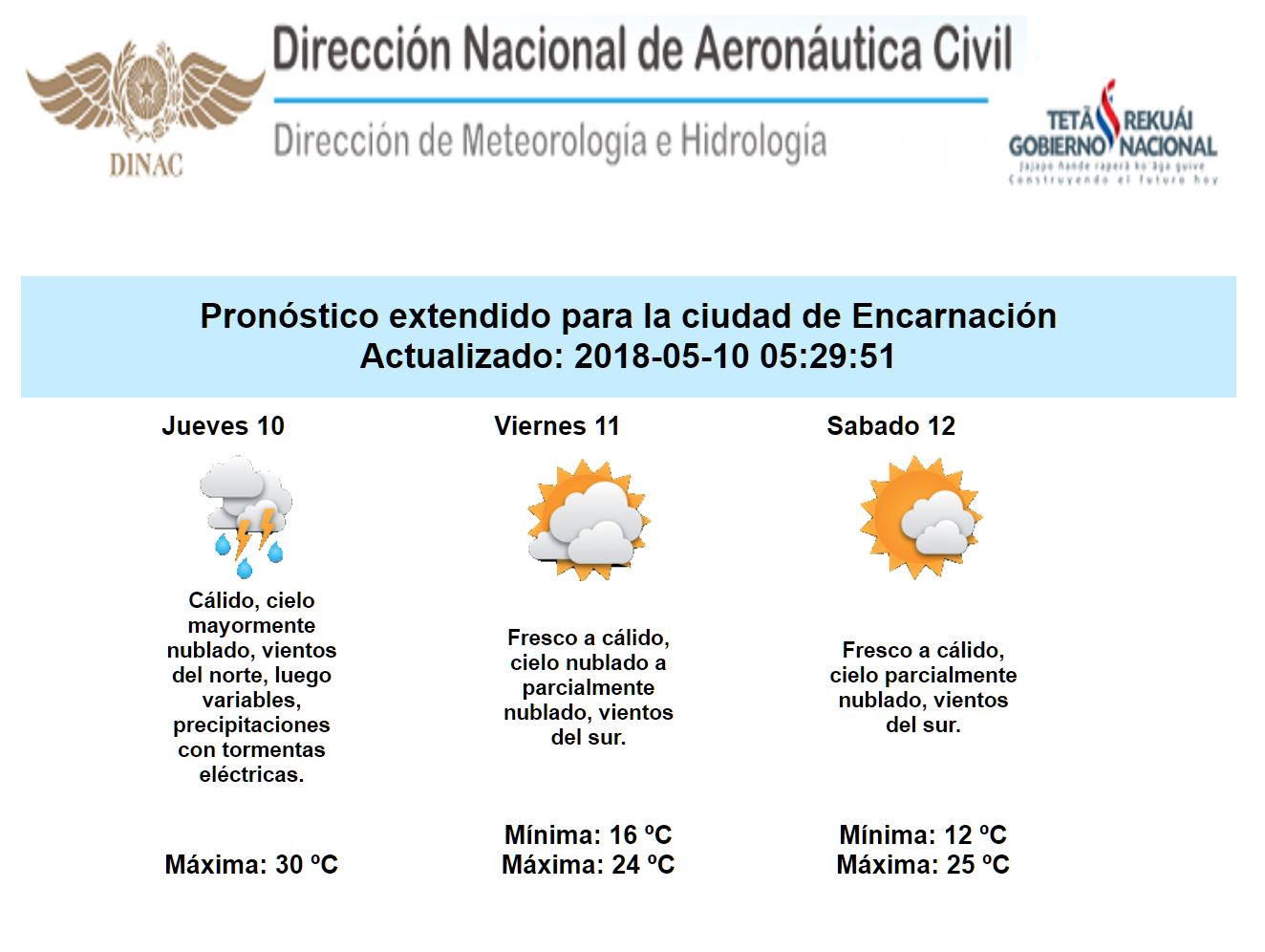 Para la jornada de hoy jueves se espera el ingreso de un sistema frontal, que en el trascurso de la mañana ingresaría a nuestro país, este traería lluvias y tormentas eléctricas de variada intensidad, siendo los departamentos del Sur los afectados primeramente para luego en el transcurso de la tarde desplazarse a los demás departamentos del Centro y Este de la región Oriental así como al Chaco. Para el día viernes las precipitaciones y tormentas eléctricas afectarían a todo el territorio nacional. No se descarta que debido a la inestabilidad se pueda producir fenómenos de tiempo severo de forma puntual con dicho sistema de tormentas.