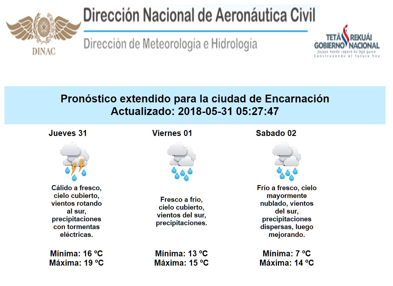 Un sistema de tormentas está afectando a parte del país; donde existe una muy alta probabilidad de la ocurrencia en forma puntual de fenómenos de tiempo severo; para la tarde se prevé que todo el territorio nacional tenga lluvias de variada intensidad. El frente frío ingresaría en el transcurso del mediodía de hoy jueves. A partir de mañana viernes con los vientos soplando del sector sur, las temperaturas irían en descenso, para el fin de semana las sensaciones térmicas también serían bajas. Las precipitaciones se mantendrían en forme ligera y dispersa hasta inicio de la próxima semana.