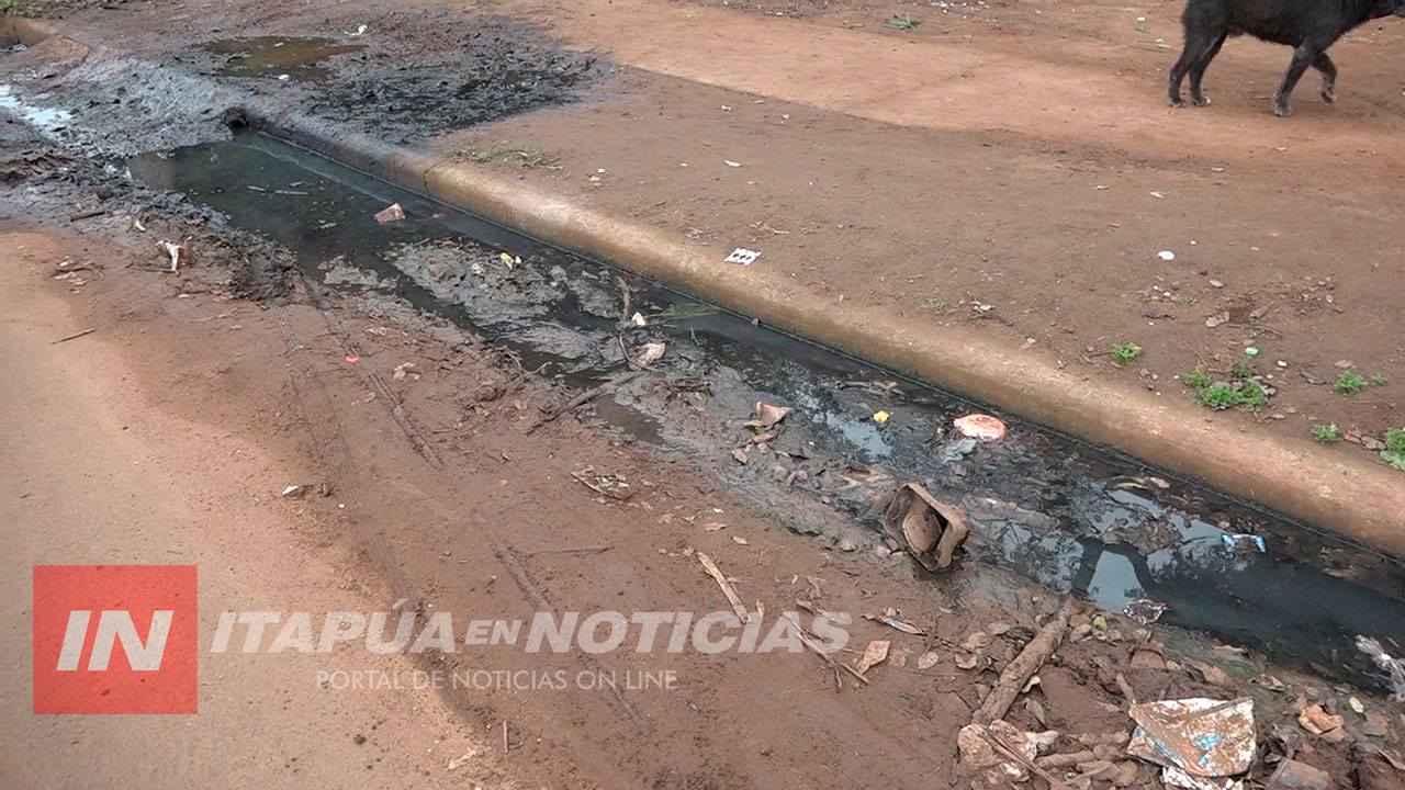 Agua estancada proveniente de residuos cloacales atraviesan viviendas del Barrio Sagrada Familia de Encarnación desde las alturas hasta la Avenida costanera que da al Río Paraná, donde quedan represadas con basura en el costado de la ruta.