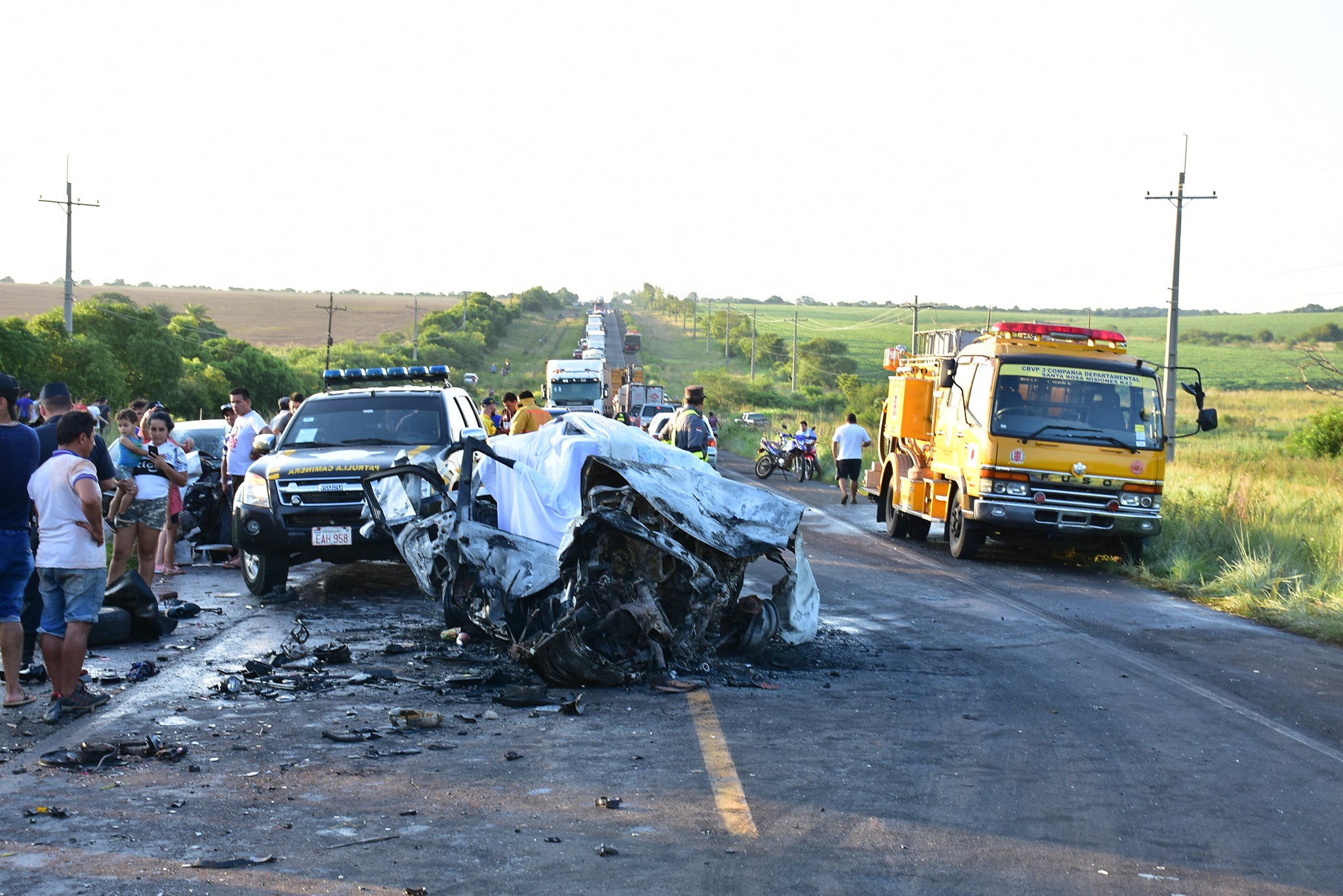 El automóvil que se llevó la peor parte sería de la marca Fiat modelo Siena, que ardió totalmente. Tras una ardua tarea, los bomberos lograron controlar la situación derivando a los lesionados y retirando los restos de hierros y vidrios que estaban sobre la ruta. Personal del Ministerio Público fue convocado en el sitio, al igual que agentes de la Patrulla Caminera y Policía Nacional.//CRÓNICA