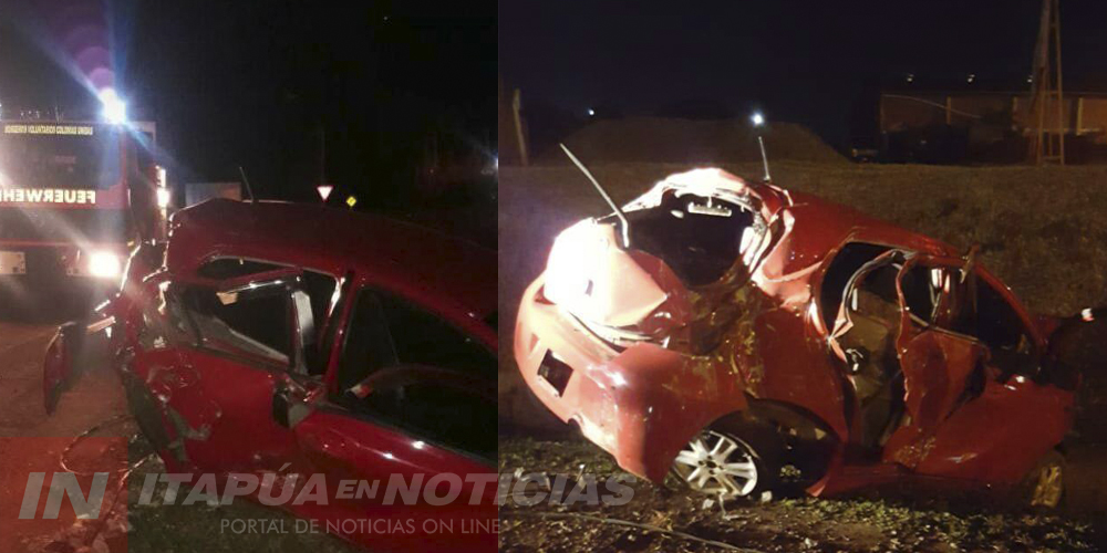 El vehículo involucrado es de la marca Toyota, modelo Vitz con Chapa N°HOY 480 guiado por Alexander Rojas Ruiz Díaz de 26 años acompañado por las jóvenes mayores de edad Erika Gamarra y Camila cuyo apellido aún no se pudo precisar, todos fueron auxiliadas por Bomberos de Colonias Unidas y se encuentran internados Hospital Regional de Encarnación (HRE), según detallaron desde la Comisaría 13 de Obligado.