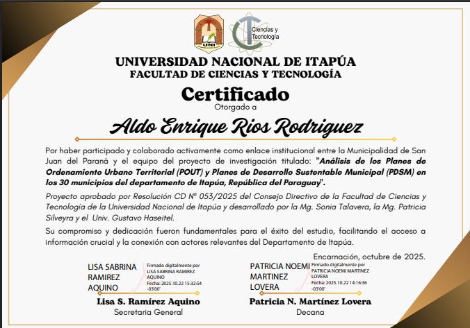 El estudio fue aprobado por la Facultad de Ciencias y Tecnología de la Universidad Nacional de Itapúa mediante la Resolución CD Nº 053/2025, y busca examinar los avances, desafíos y estrategias implementadas por los municipios itapuenses en materia de ordenamiento territorial y desarrollo sostenible.