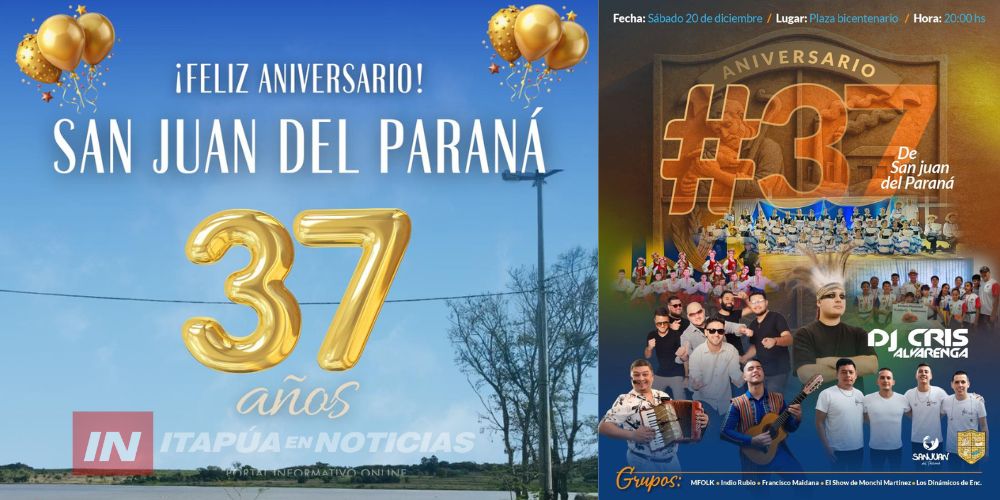 San Juan del Paraná. La comunidad de San Juan del Paraná celebra este fin de semana su 37° aniversario de vida institucional con una agenda que combina importantes avances en infraestructura y actividades culturales destinadas a toda la ciudadanía.