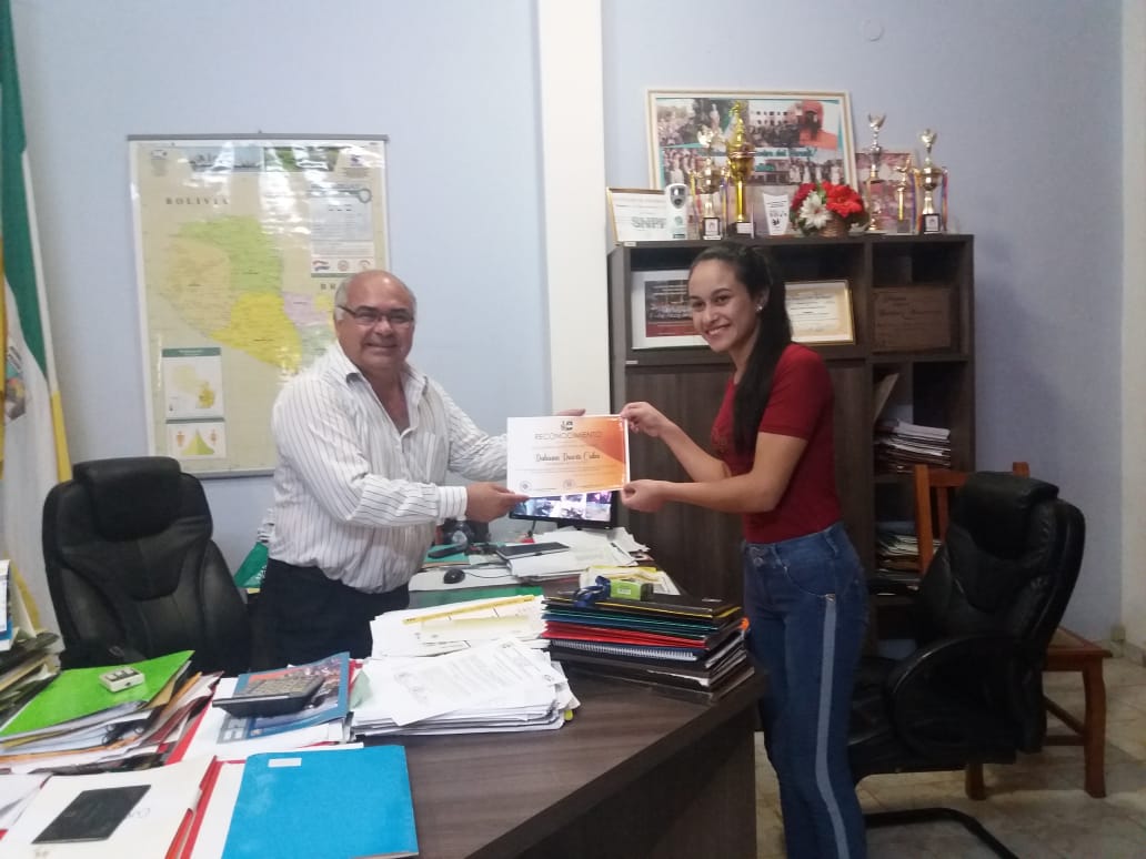 El Intendente Municipal de San Pedro del Paraná, Arq. Domingo Elieser Cáceres, en la mañana de hoy entregó un reconocimiento y una bandera distrital a la universitaria Dahiana Duarte Cuba, estudiante de la carrera de Licenciatura en Administración de Empresas Agropecuarias de la FaCAF, sede San Pedro del Paraná, quien va de intercambio a la Universidad Nacional de Formosa – Argentina, por medio del programa de la Zona de Integración del Centro Oeste de América del Sur (ZICOSUR), para cursar este primer semestre del año.