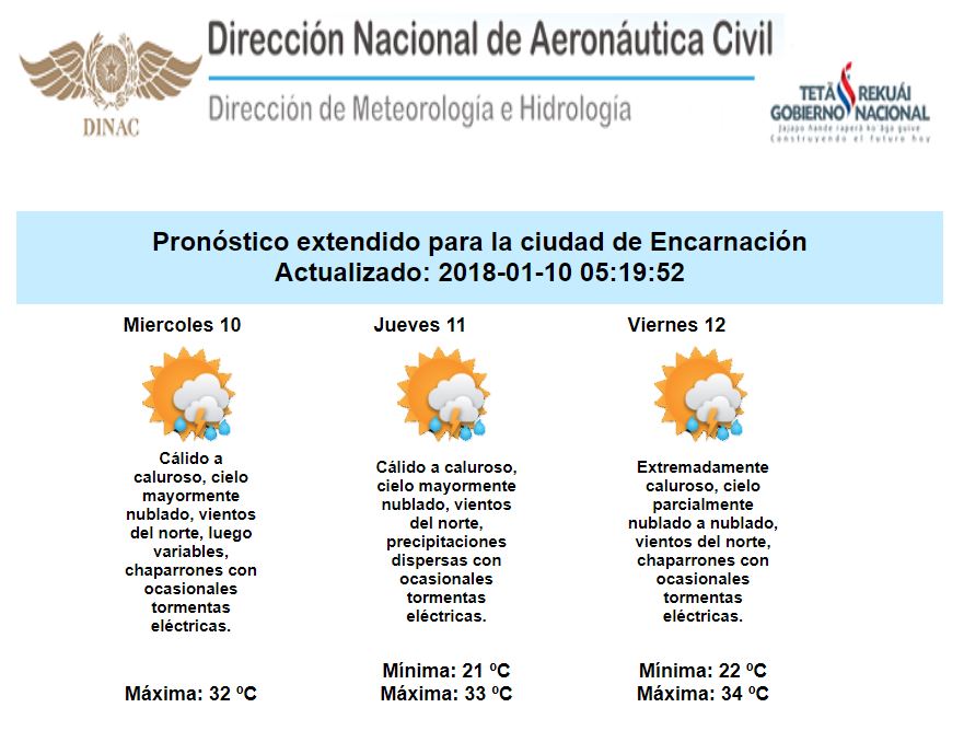 Los distintos análisis continúan indicando que la probabilidad de lluvias se mantiene alta para hoy miércoles donde se esperan algunos chaparrones y eventuales tormentas sobre los departamentos del centro y sur y el bajo Chaco, en tanto que sobre el este y norte de la región Oriental y el centro y norte de la región Occidental se esperan lluvias más generalizadas con ocasionales tormentas eléctricas. Se prevé que las condiciones inestables persistan sobre nuestro país durante los próximos días, incluso con fenómenos puntualmente importantes.