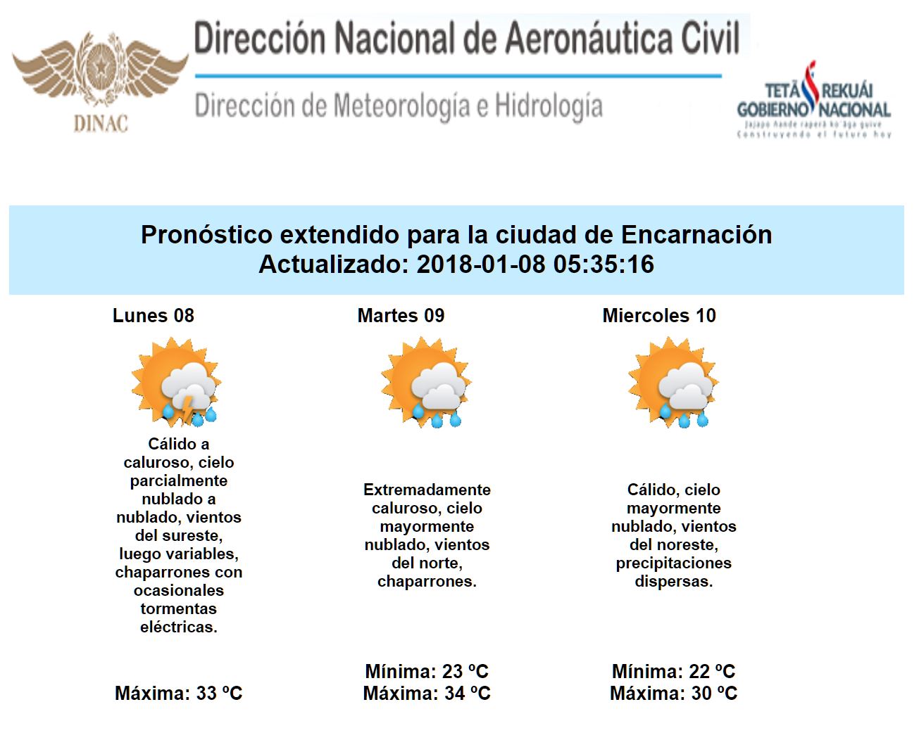 Mañana martes el ambiente se tornaría extremadamente calurosa en gran parte del país, con temperaturas máximas que llegarían hasta los 38°C en algunos puntos del Chaco y 35°C en el sur de la Región Oriental, con respecto a las lluvias, las mismas serian principalmente del tipo chaparrones en forma aislada sobre el centro y sur del país, en tanto que sobre el norte y este se presentarían acompañados de ocasionales tormentas eléctricas.