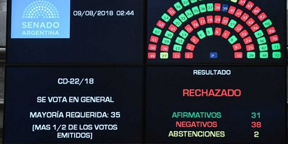 El aborto legal tendrá que esperar. Por 38 votos negativos, 31 positivos y dos abstenciones, el Senado estampó su sello “celeste” y sepultó el proyecto aprobado en la Cámara de Diputados, en una jornada histórica marcada por masivas movilizaciones a favor y en contra de la ley de interrupción voluntaria del embarazo, que tendrá una nueva oportunidad recién en 2020, con la próxima renovación parlamentaria.