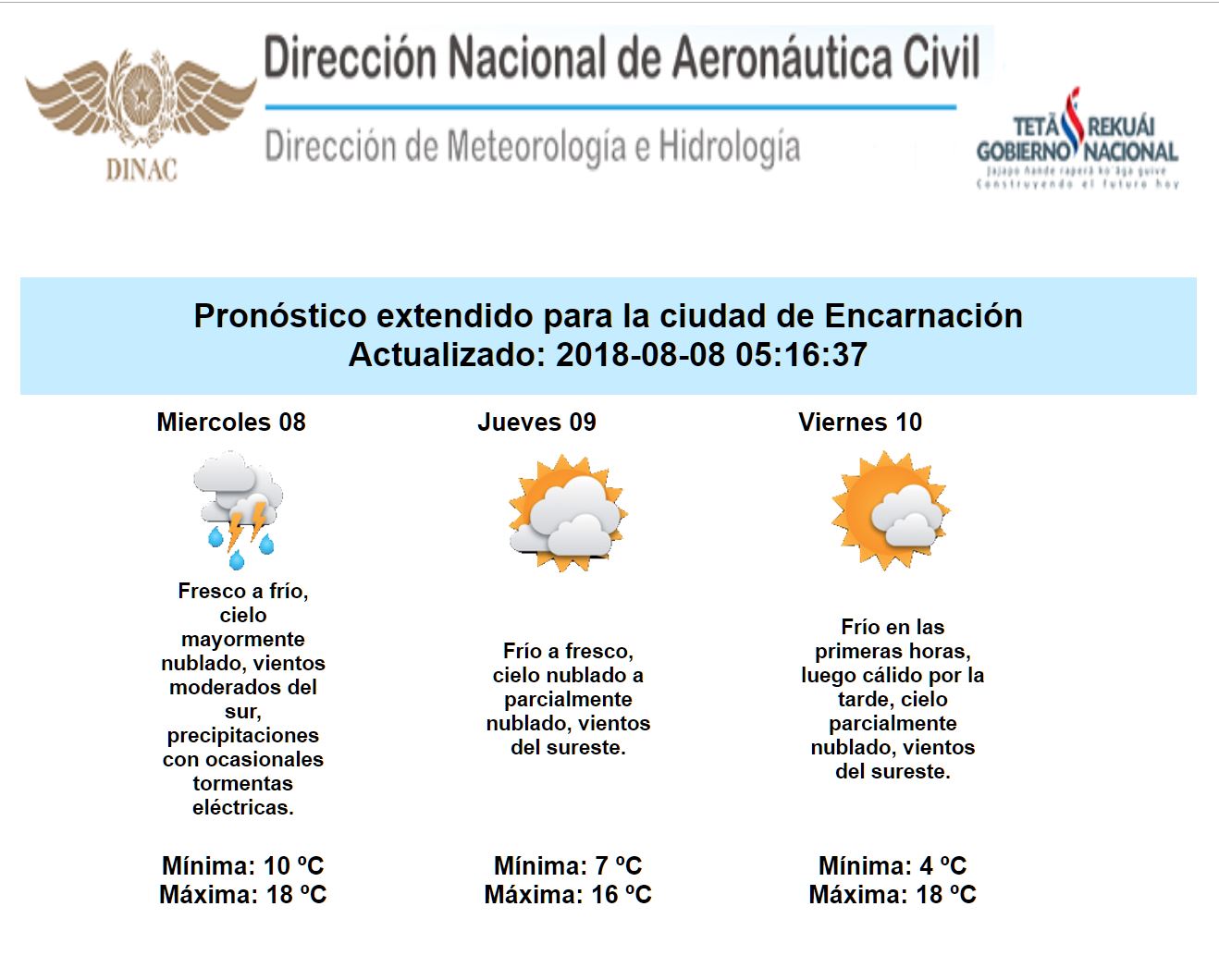 El día de hoy miércoles, en todo el territorio nacional se presenta un ambiente inestable, con lluvias y tormentas eléctricas, que en principio fueron afectando al sur y este de la región Oriental, a medida que avance el frente, con vientos moderados del sur, las tormentas se estarían trasladando al norte del país, mejorando así las condiciones del tiempo para el centro y sur de la región Oriental. En el Chaco las precipitaciones irían presentándose de manera leve y dispersa.