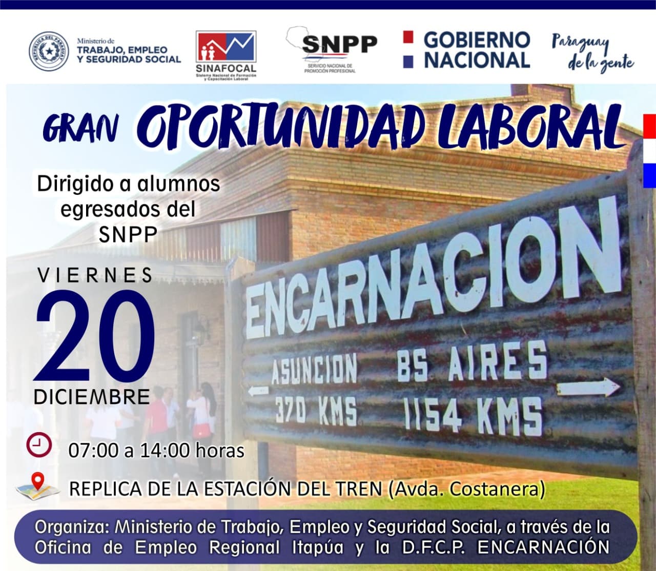 Para este viernes de 07:00 a 14:00hs. el SNPP Encarnación junto a la Oficina Regional del Ministerio de Empleo Itapúa preparan una Feria de Empleo que se realizará en la Réplica de la Estación de Ferrocarril, específicamente en el área verde ya que a última hora se superpuso otra actividad en el mismo lugar.