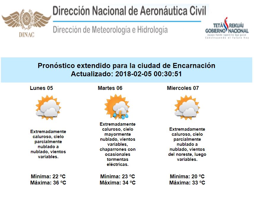 Durante la jornada de hoy domingo y por lo menos hasta mediados de la semana en gran parte del país, la probabilidad de lluvias se mantendrá muy baja y en cuanto al ambiente, seguiríamos con marcas térmicas altas, las cuales estarían en el orden de los 33 a 37 grados en la Región Oriental y de 37 a 40 grados en el Chaco.