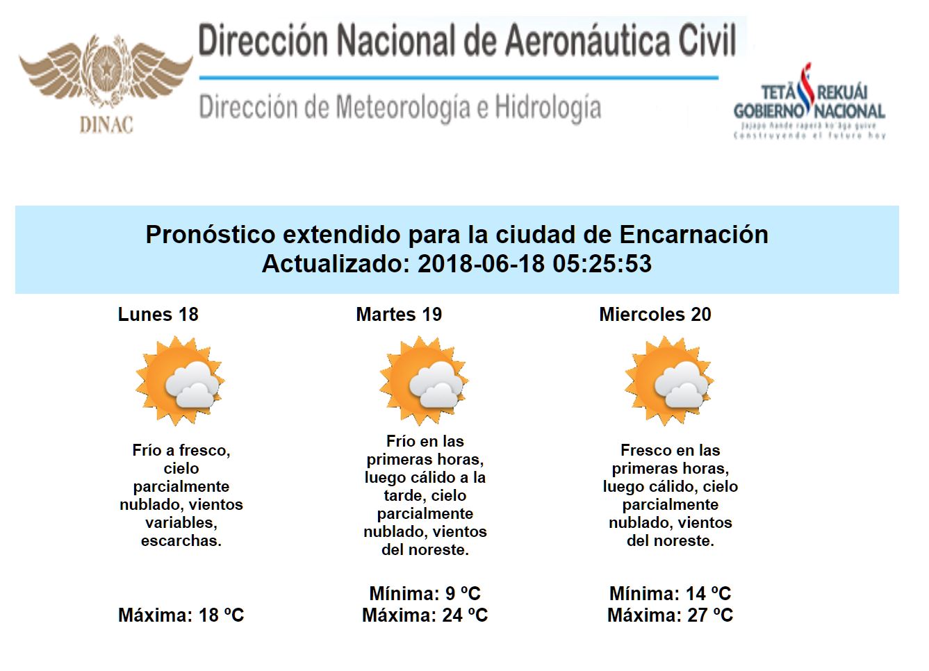 La jornada de hoy se presenta aun fría en el transcurso de la mañana, con los vientos rotundo al sector norte durante la tarde, esta se tornaría más cálida. A partir de mañana las temperaturas irían en aumento con amaneceres frescos y tardes cálidas, inclusive calurosas en algunos sectores del país. Para el fin de semana el ambiente seria cálido en la mayoría del día. Las probabilidades de precipitaciones se mantienen bajas en todo el territorio nacional durante esta semana.