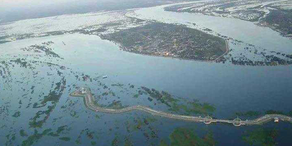 Terrible imagen de la inundación en Alberdi, una V corta forma el río Paraguay en el centro esta la ciudad. CAPITANBADO.COM